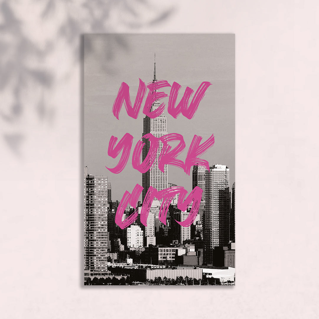 Dale a tus espacios la energía única de la Gran Manzana con este cuadro inspirado en el icónico skyline de Nueva York. Su diseño en blanco y negro con tipografía en rosa vibrante aporta un contraste moderno, elegante y lleno de personalidad.