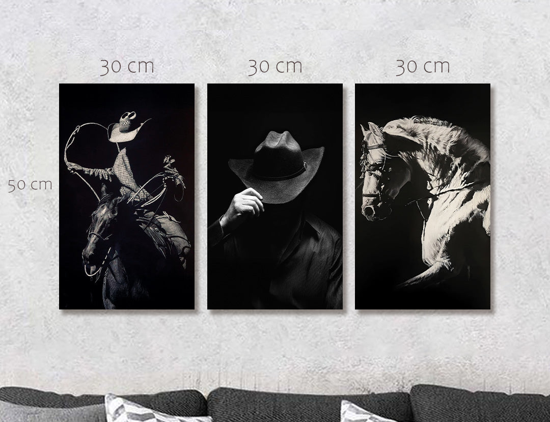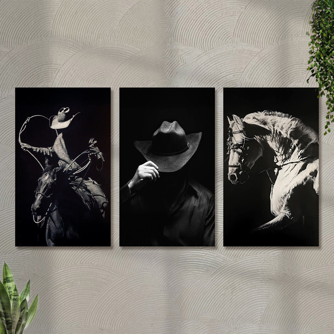 Un homenaje a la fuerza, la libertad y la esencia del llanera. Este conjunto de tres cuadros en blanco y negro captura la conexión del hombre con el caballo, el misterio de la sombra y la imponencia del espíritu llanero.
