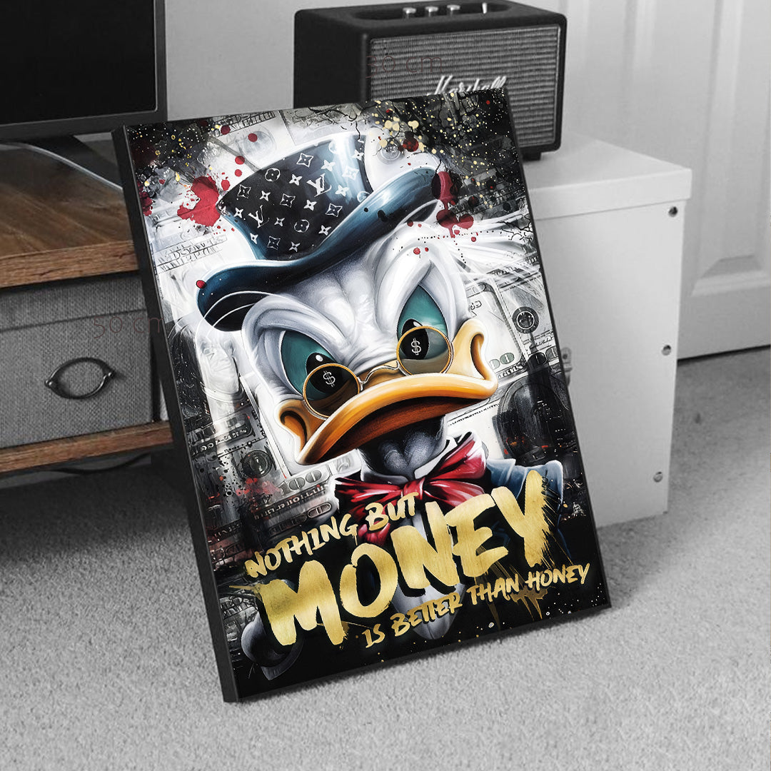 Un diseño explosivo y moderno con el icónico Pato Millonario en versión urbana, con gafas de dólar, sombrero de lujo y un fondo lleno de billetes. El texto “Nothing but MONEY is better than honey” resalta en dorado, aportando un toque atrevido y lleno de personalidad.